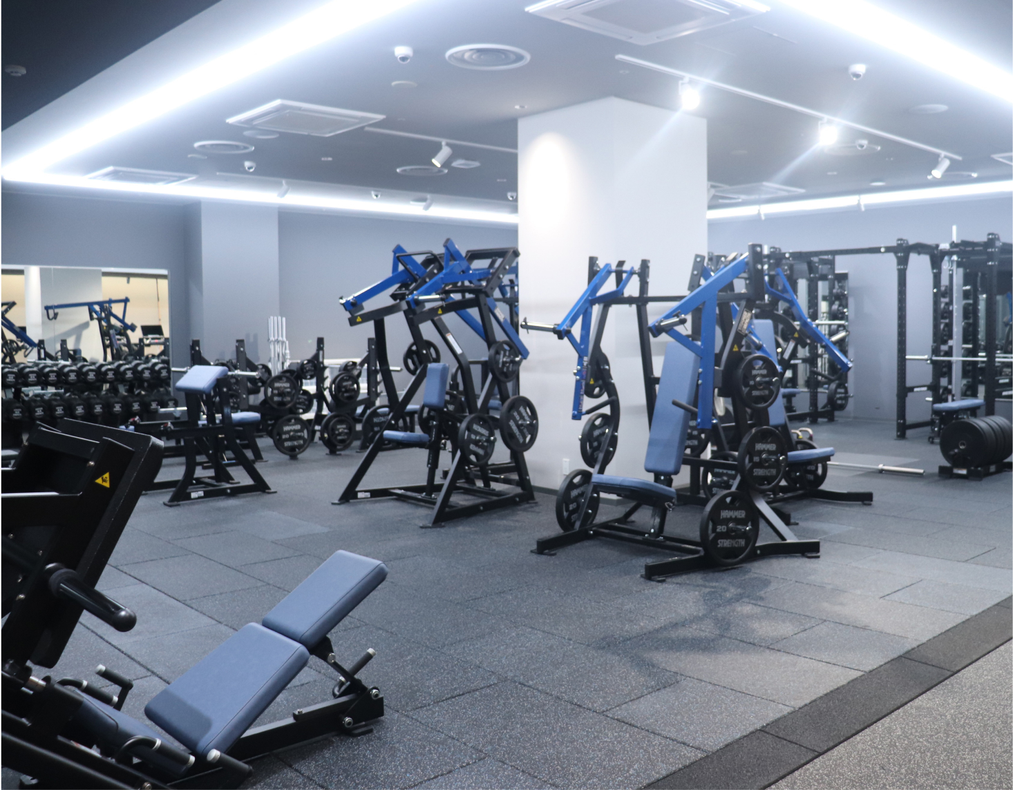 有酸素マシンをはじめ、ピンによる負荷調整が可能な安全性の高いマシン、プレートローディングマシン、ケーブルマシン、さらには本格的なウエイトトレーニングに対応したフリーウエイトまで、計57台のトレーニングマシンを導入。